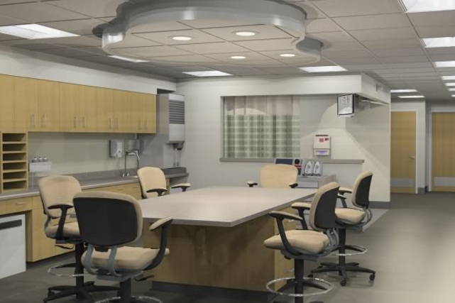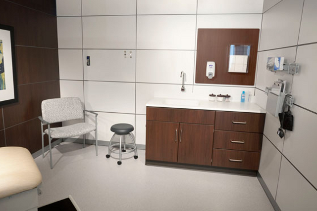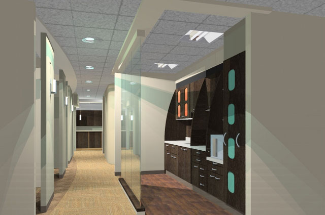 The work environment for medical and healthcare office space for staff and especially MD associates is usually the reality of a small closet. Flextime workstations will always equate to wherever you can set the laptop with a good WIFI signal. This Flextime work area has been designed to use natural light with a window line of 10′ in an impossible corner with some landscape as a view. This makes a great space for end of day patient exam transcription, charts and communication.